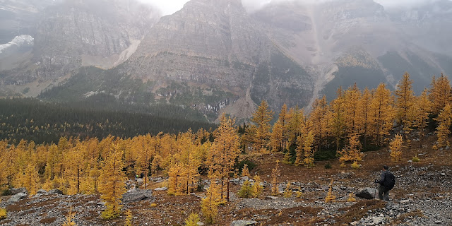 岭的北端背阳下坡陡峭,石头中还有冰雪,几乎见不到人踏出来的路径。大家目标坡下依稀小路,由于第一次走路不熟只能直下,其实到了下面才发现有人踩出来的之字形羊肠小道,不过运动达人风趣地说:我们也算勇敢地尝试了踏石而下!到了下面没走多久,一片金黄落叶松林再次袭来:天堂谷,我们来了!